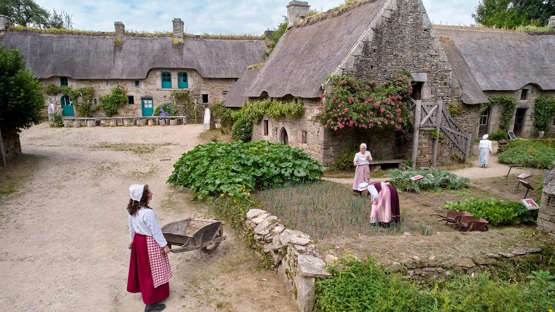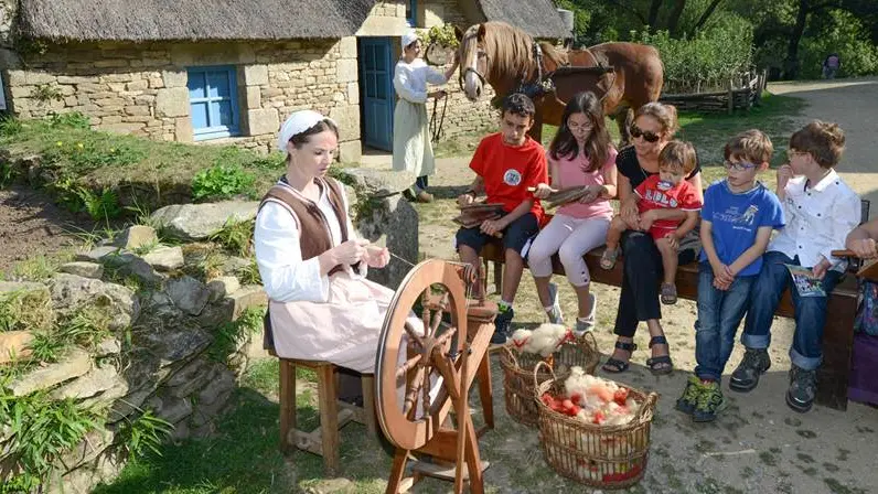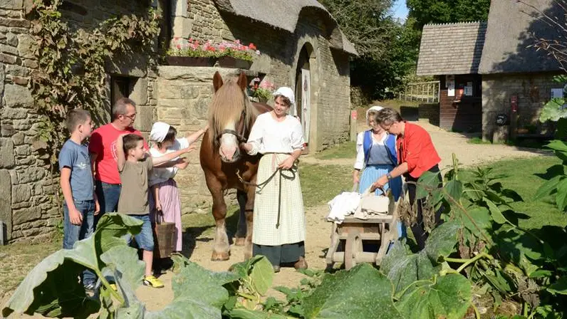 En el corazón de un auténtico pueblo bretón, retroceda en el tiempo hasta 1850, donde los habitantes ataviados con trajes de época recrean las costumbres y habilidades de antaño, como si estuviera allí… o casi. Disfrute de espectáculos y demostraciones (elaboración de mantequilla, hilado de lana, preparación de crepes de trigo sarraceno) y déjese llevar por las charlas de las lavanderas. Participe en los juegos tradicionales bretones, conozca a los animales de la granja y aprenda sobre las costumbres del pasado. Para prolongar la experiencia, saboree deliciosos platos gourmet junto a la chimenea o disfrute de un picnic a la sombra de los castaños. El Taller de Fotografía ofrece una sesión fotográfica con traje tradicional para inmortalizar su viaje al pasado. En 12 hectáreas de paisaje natural, disfrute de una auténtica y agradable excursión para toda la familia. Pasee por el corazón del brezal bretón a orillas del río Blavet. Se admiten perros con correa. El lugar es parcialmente accesible para personas con movilidad reducida.