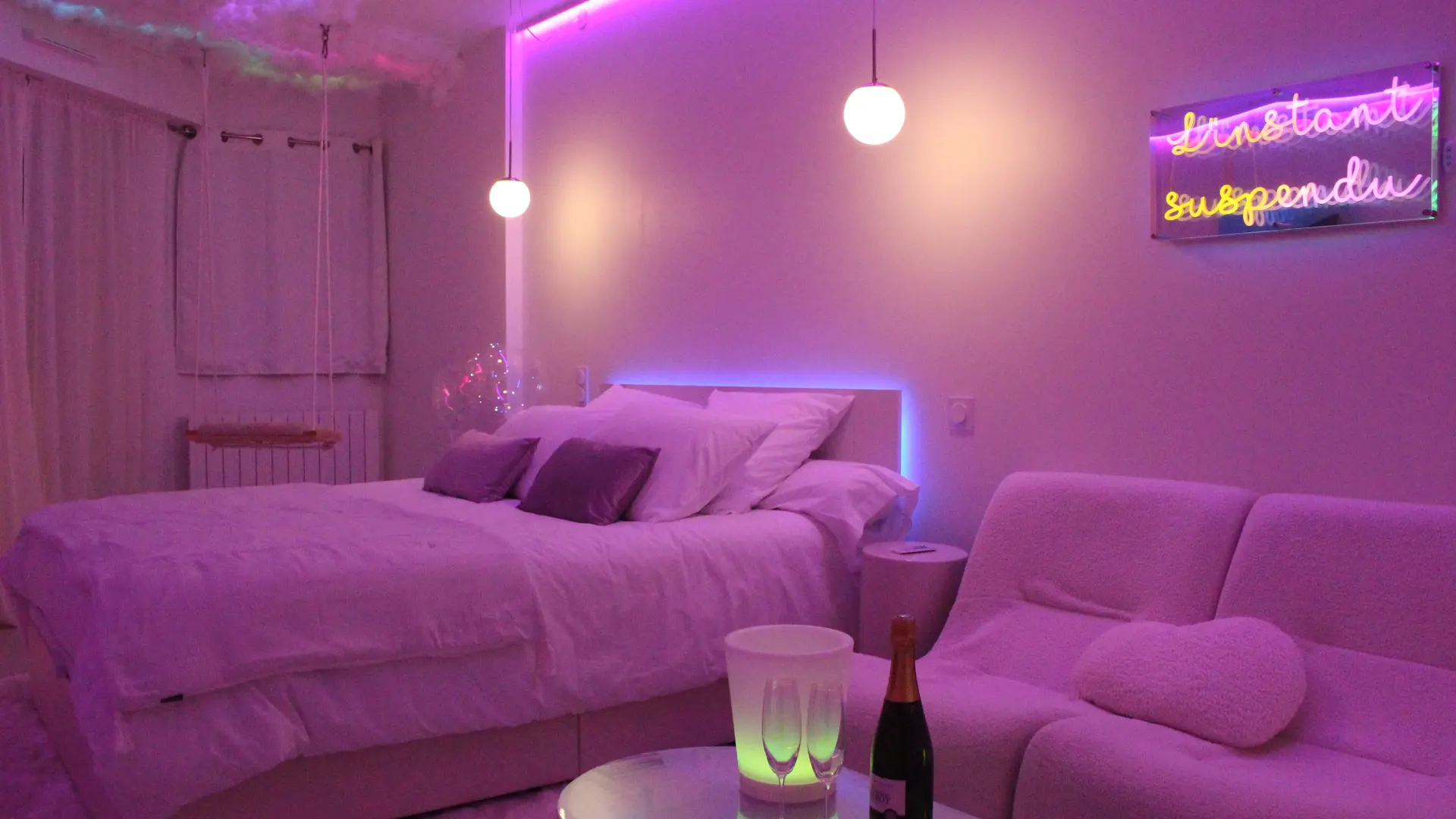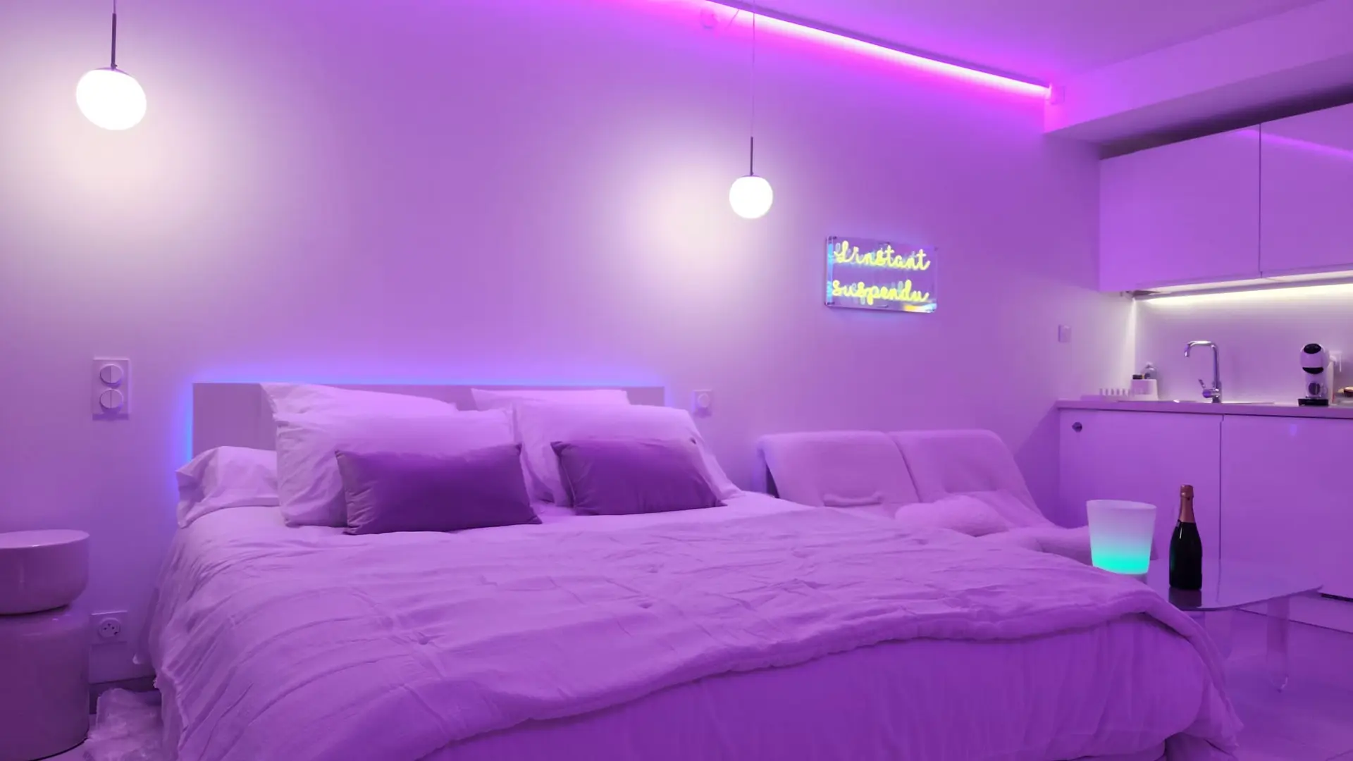 Ubicado en el corazón de Questembert, L'Instant Suspendu ofrece un auténtico remanso de paz y romance a menos de 30 minutos de las playas y de Vannes. Diseñada para parejas o grupos de amigos que buscan relajación e intimidad, esta suite de 33 m² les da la bienvenida a un ambiente tranquilo e íntimo. La iluminación tenue, la bañera de hidromasaje, la cama queen size de calidad hotelera, la ducha doble y un pequeño salón al aire libre crean un ambiente relajante, perfecto para celebrar un evento o simplemente disfrutar de una escapada romántica.