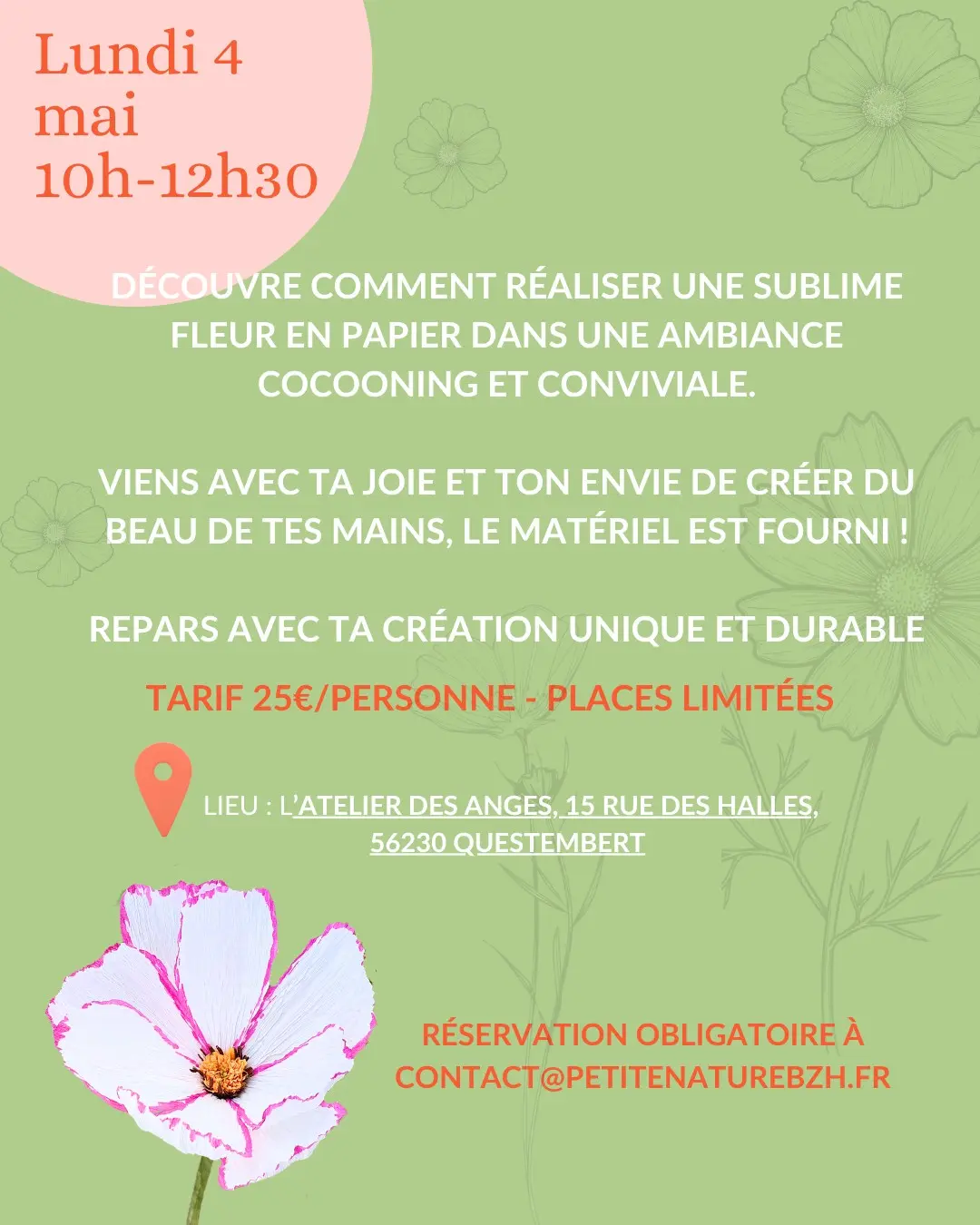 Descubra cómo crear una impresionante flor de papel en un ambiente acogedor y agradable. Venga con alegría y ganas de crear algo hermoso con sus propias manos. Se proporcionan los materiales. Lleve su creación única y duradera. ¡Se requiere reservación; plazas limitadas! Descubra el mundo de Petite nature bzh, una empresa creativa de flores de papel en Morbihan, Bretaña. "Todas mis flores y plantas de papel están hechas a mano según sus deseos. Me inspiro en las formas, colores y emociones que me ofrece la naturaleza. Después viene el delicado arte de crear flores de papel, cuyo único límite es la imaginación. Déjese llevar por el placer de tener la belleza en sus manos."
