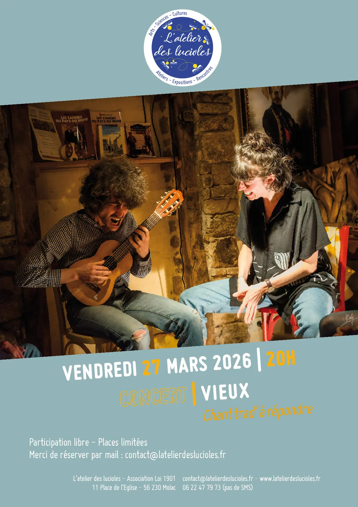 "Vieux" es un dúo que interpreta canciones lo suficientemente antiguas como para haber madurado un poco. Encontrarán, en particular, canciones de llamada y respuesta de Le Mené, la montaña casi plana en la región galoparlante de Côtes d'Armor. Tradicionalmente, se les pedirá que respondan a estribillos extraños, pero la mayor parte del trabajo vocal estará a cargo de Louise Genin (voz) y Jérémie Chapelain (voz y guitarra pequeña). La idea es jugar con el concepto de transmisión, explorar nuevas formas de empatía, simplemente cantar con fantasmas. Entrada gratuita – Aforo limitado – Se requiere reserva previa contactándonos por correo electrónico. (No duden en revisar su carpeta de correo no deseado si no reciben respuesta).