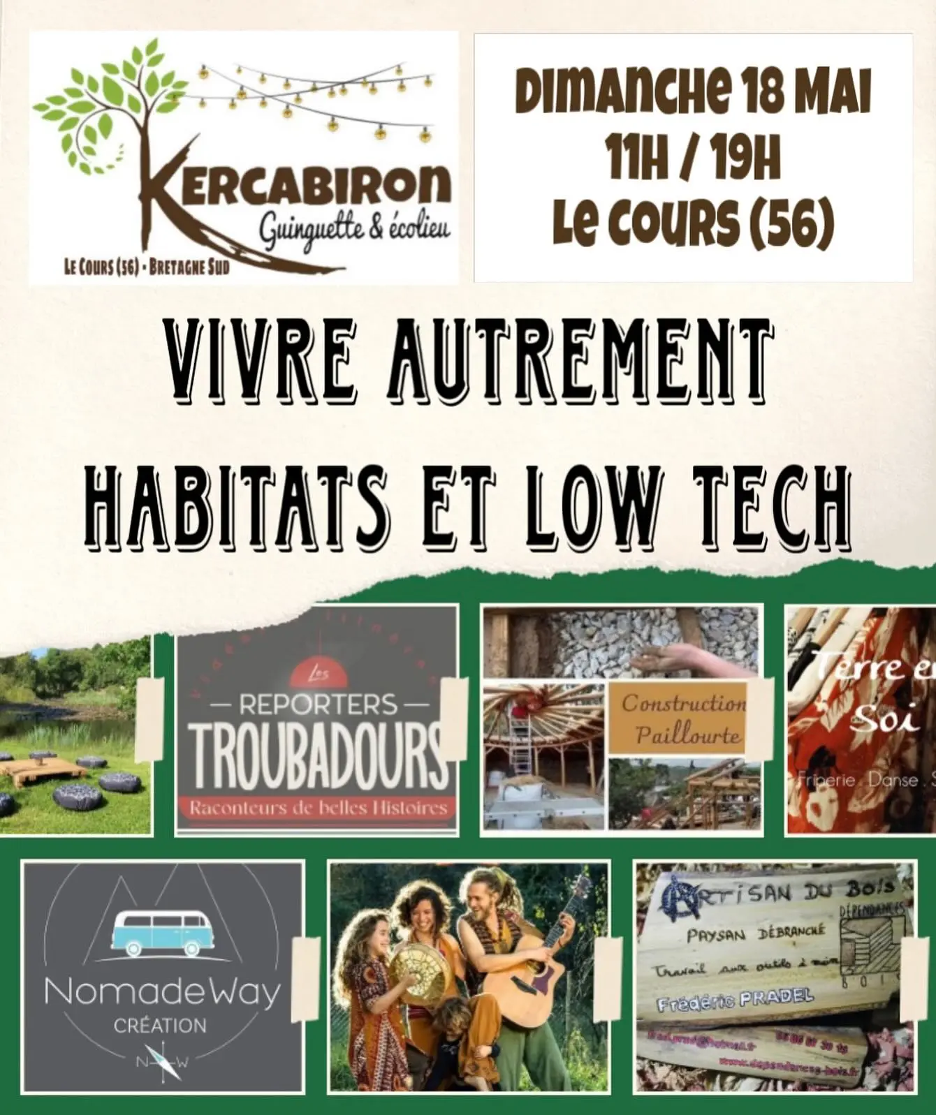 Ven a descubrir asociaciones/estructuras para intercambiar y/o descubrir hábitats reversibles, estilos de vida alternativos y minimalistas, low tech... En el lugar: panqueques, crepes y helados. A las 13:00 h. -> Concierto "Joa siembra sus semillas" La pequeña familia de "Joa Sème ses graines" compartirá con nosotros sus canciones con sus letras iluminadas y sus melodías mágicas. Textos comprometidos para un nuevo mundo en colores que despierten nuestras conciencias con corazón y buen humor. ¡Recuerde traer cambio para los sombreros de los artistas! REPORTEROS TROVADORES Ofrecen proyecciones de cortometrajes para compartir sus historias y encuentros. La Asociación Mycélium' Naturaleza y Construcción (Pluvigner - 56) estará presente para hablar de ecoconstrucción, cabañas de paja circulares y construcción con tierra. NomadeWay Création Tiphaine Le Gad, carpintera artesana, presentará su empresa de diseño de interiores de furgonetas y fabricación artesanal de muebles de madera. Ven a descubrir durante todo el día el trabajo de la madera sin herramientas mecánicas. Fred de la empresa Dépendances Bois te contará sobre la artesanía de la madera sin máquinas, electricidad ni aceite. Terre en Soi, la tienda asociativa de segunda mano de Questembert, estará presente durante esta jornada. 〰️ A las 15 h: MESA REDONDA SOBRE LOW TECH Léandre vive en grupo y domina las técnicas de ecoconstrucción. También desarrolló reflexiones sobre low tech que podrá compartir con vosotros durante esta mesa redonda. 〰️ A las 11h y a las 16h: MESAS REDONDAS sobre hábitats reversibles y vida en eco-lugares Los temas son muy amplios y darán lugar a diversos debates. 12 p.m. y las 5 p.m. -> Visita a Éco Penty - Aldea de hábitats luminosos con yurtas, minicasas y chalets Información práctica: Acceso libre, abierto a todos. Horario habitual de apertura de la guinguette: jueves a partir de las 17 h. hasta las 19 horas, viernes a partir de las 17 horas. hasta las 23 horas, domingo de 11 a 19 horas.