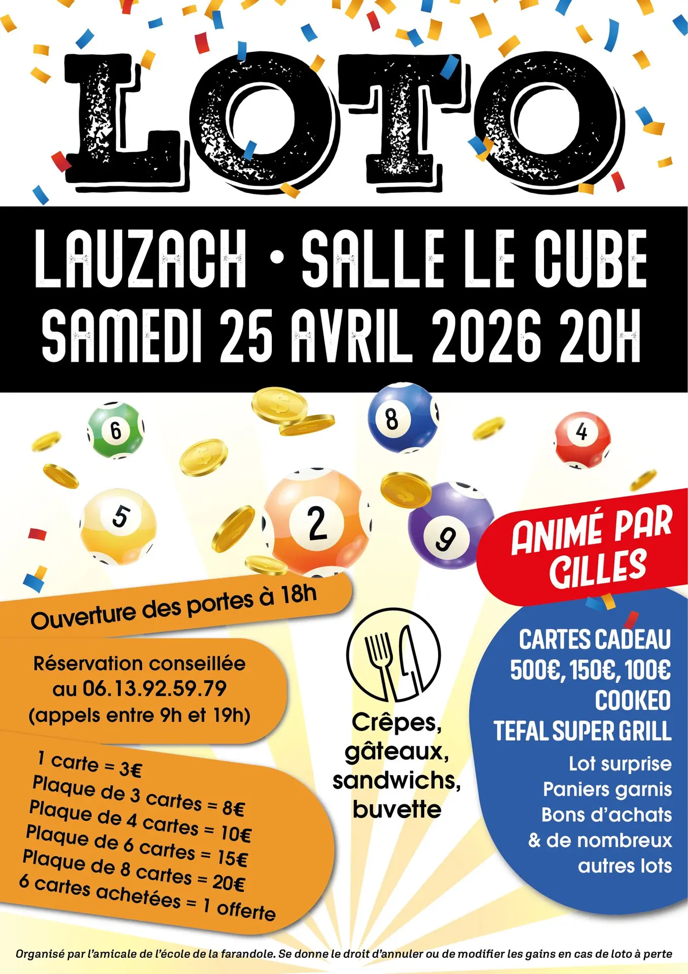 Presentado por Gilles. Las puertas abren a las 18:00, el bingo empieza a las 20:00. ¡No dudes en llamar con antelación, ya que las entradas para la noche de bingo se agotan todos los años! Precios de los cartones: 3 € por un cartón, 8 € por 3 cartones, 10 € por un cartón de 4 cartones, 15 € por un cartón de 6 cartones, 20 € por un cartón de 8 cartones. Habrá crepes, pasteles, sándwiches y bebidas.