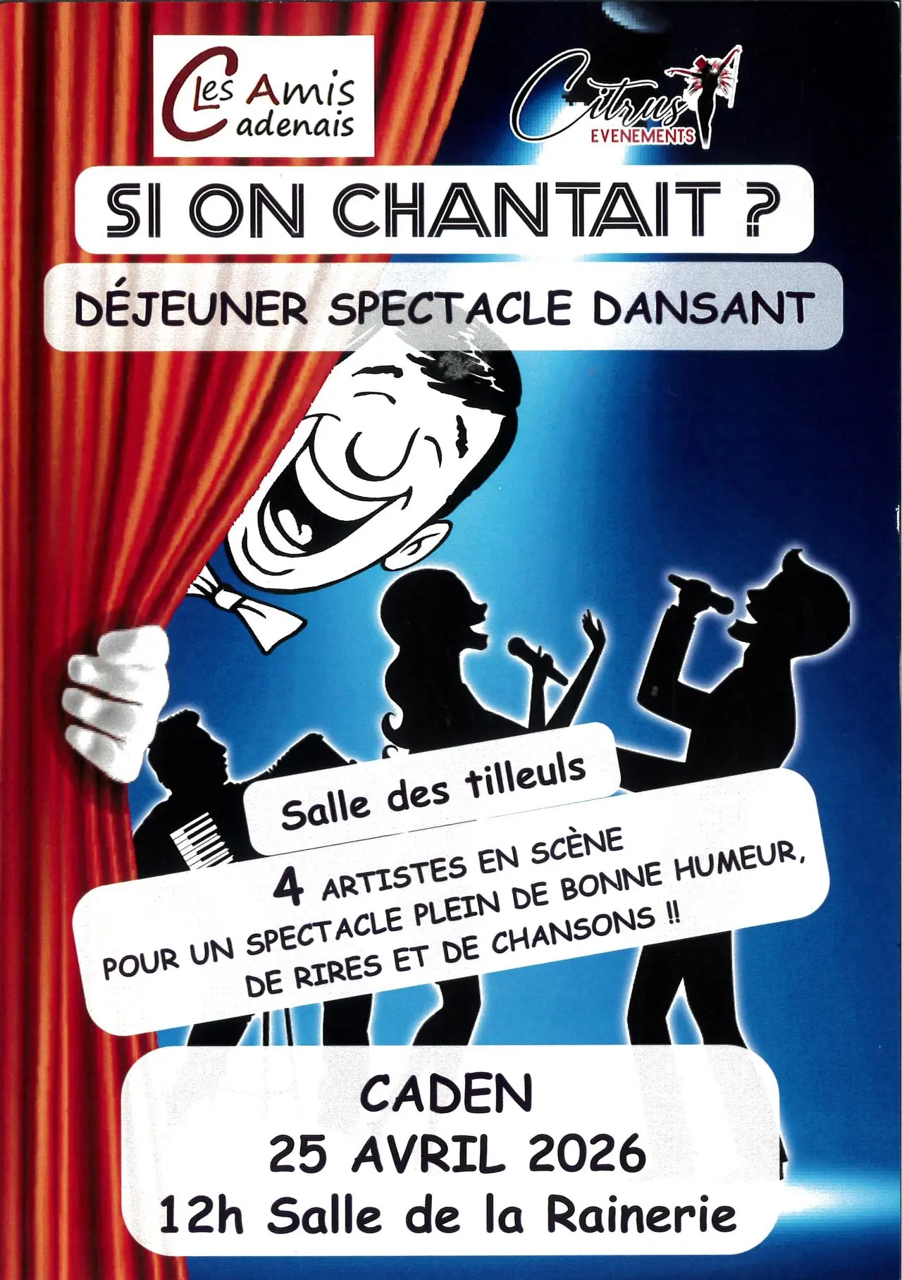 Un espectáculo de danza precedido de un almuerzo (se requiere reserva). * Espectáculo en la Salle des Tilleuls: 4 artistas en el escenario para un espectáculo lleno de buen humor, risas y canciones. * Almuerzo en la Salle de la Rainerie: Foie gras y rabo de buey cocinados al punto, salsa tártara, tomates confitados y tostadas. Sorbete de manzana. Cerdo confitado tierno, salsa de mostaza y miel, puré de patatas y zanahorias asadas. Dúo de quesos y ensalada. Postre crujiente del chef Michel, crema de vainilla y coulis de fruta fresca. Café/Vino