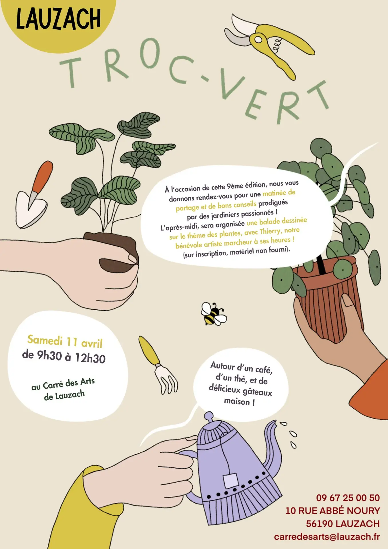 Intercambio de Plantas de 9:30 a 12:30. Sin límite de tiempo. Abierto a todos. Ven a intercambiar tus plantas, semillas, esquejes, herramientas o simplemente consejos de jardinería en un ambiente agradable y alegre. Tanto si tienes mano para la jardinería como si simplemente quieres charlar tomando un café, ¡únete a nosotros para cultivar el intercambio y la buena voluntad en el corazón de Lauzach! En esta ocasión, tenemos previsto lo siguiente: - Venta de libros (novelas, cómics, revistas para niños y adultos) durante toda la mañana :) Precio único: 1 €. - Paseo guiado de dibujo sobre el tema de las plantas con Thierry, nuestro artista y paseante en su tiempo libre. A las 14:30. Duración: 1 hora. Para adolescentes y adultos. Es necesario inscribirse, plazas limitadas (6). No se proporcionan materiales. Todas las actividades están patrocinadas por el ayuntamiento de Lauzach. Sigue al Carré des Arts en su página de Facebook.