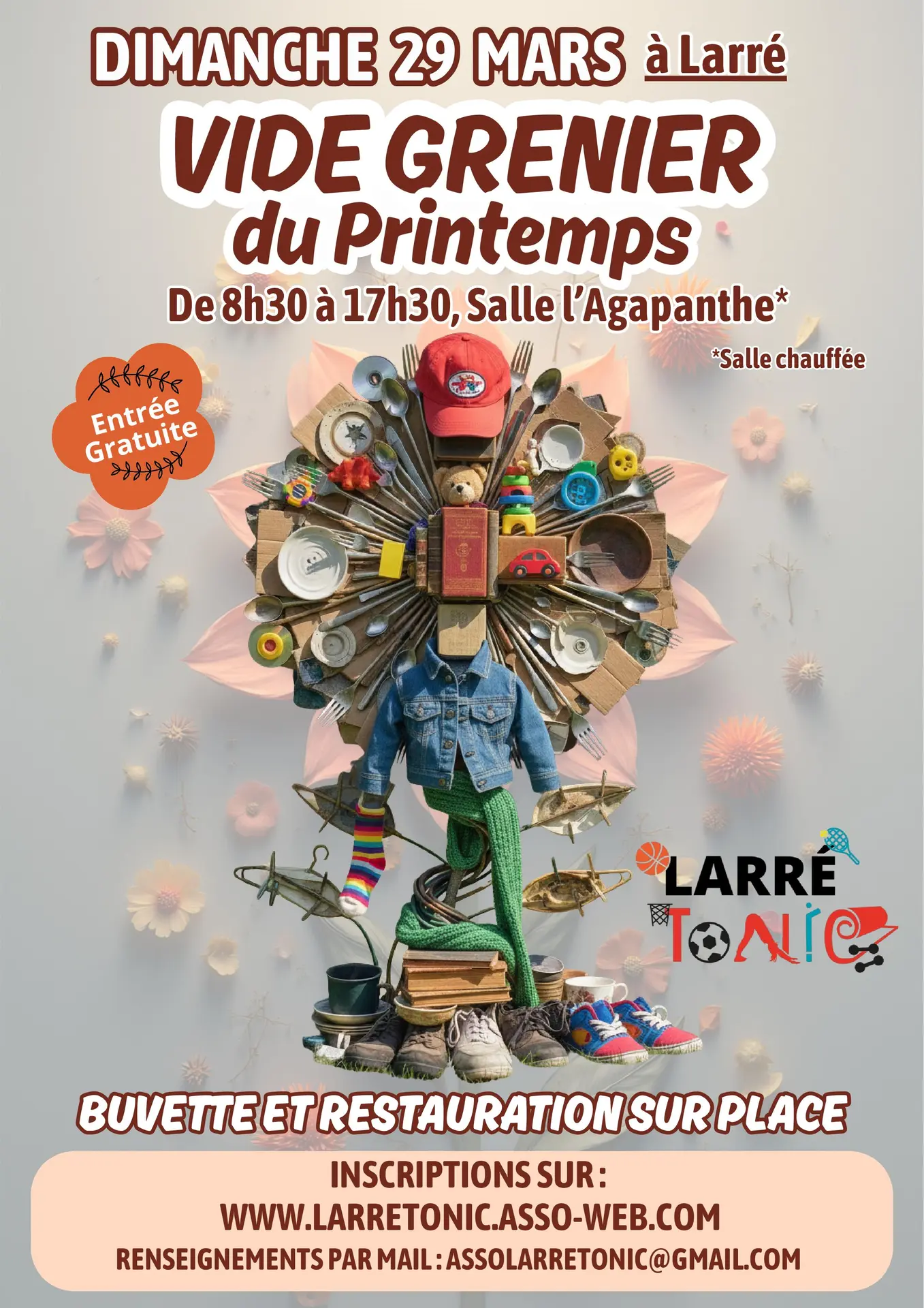 ¡Ven y encuentra grandes ofertas! La asociación Larré Tonic organiza su 14.º Mercado de Pulgas de Primavera. Entrada gratuita. Habrá un puesto de refrigerios y comidas ligeras. Puedes contactarnos e inscribirte en la página web y por correo electrónico.